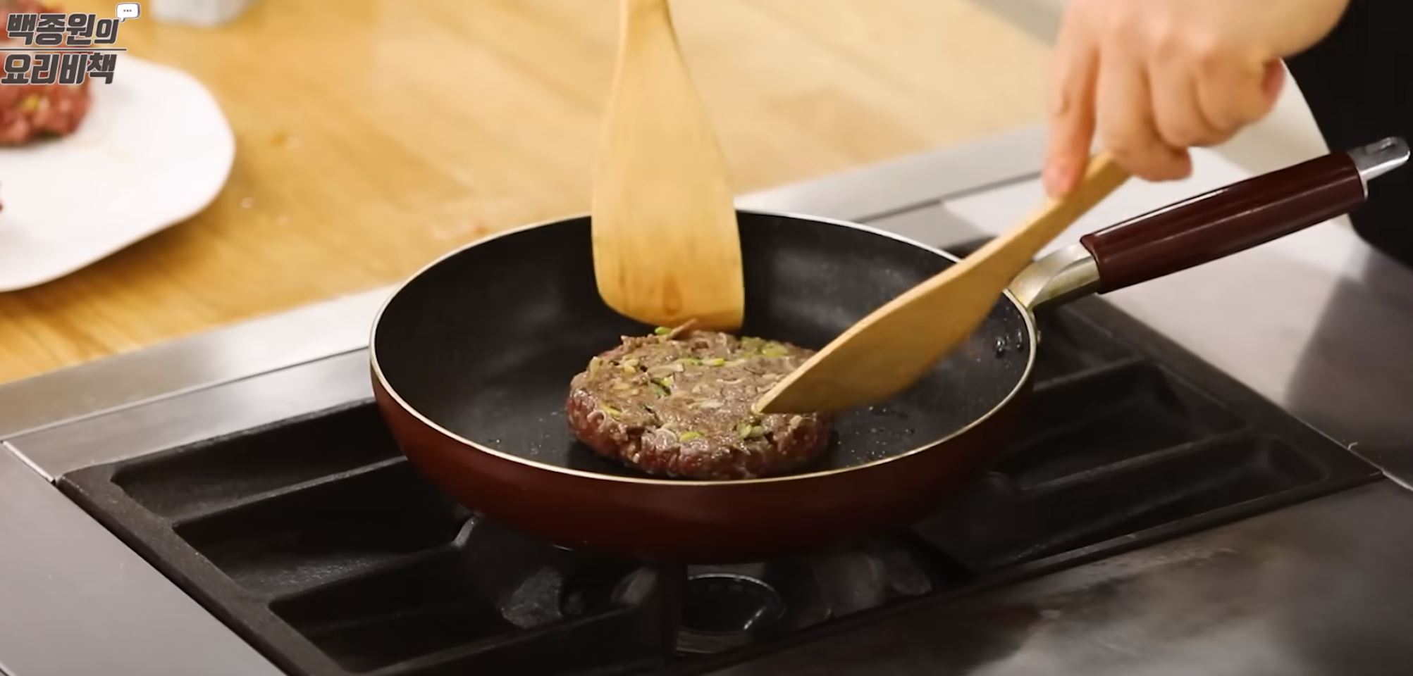 - 아래 쪽 면의 색이 갈색으로 변하면 주걱 두 개를 사용하여 뒤집는다.